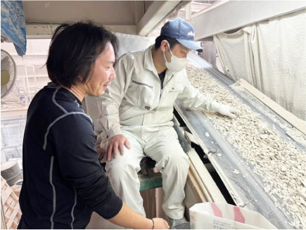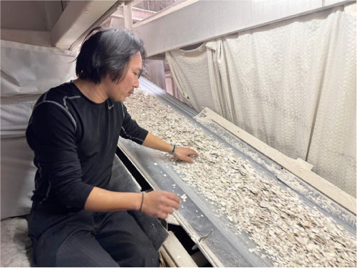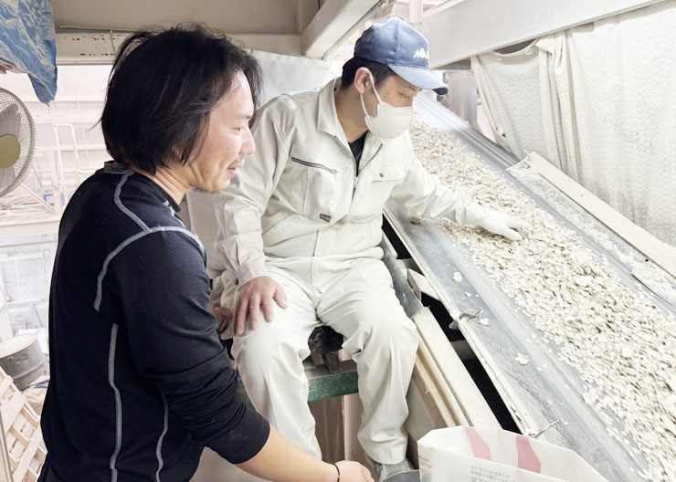 牡蠣養殖に携わる方々と協力し、業界全体の発展を支えるために、牡蠣殻製品を作る工場や、養殖に必要なホタテ貝盤を加工する工場も運営しています。